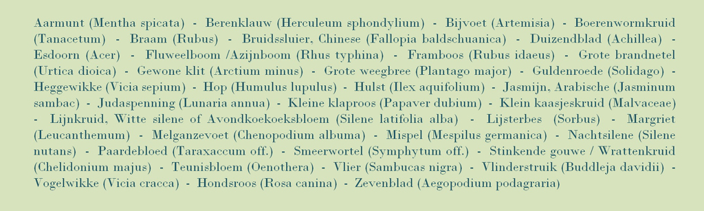 In de publieke ‘wildtuin’ op de hoek van mijn straat kwam ik jaren geleden tot onderstaande inventaris. Toch nog aardig divers voor een stadstuin die, allengskens (mijn favoriete Rumpf-woord) door hop, braam en brandnetel overwoekerd, inmiddels een braaf aangeharkt perkje is geworden (de mispel mocht gelukkig blijven).